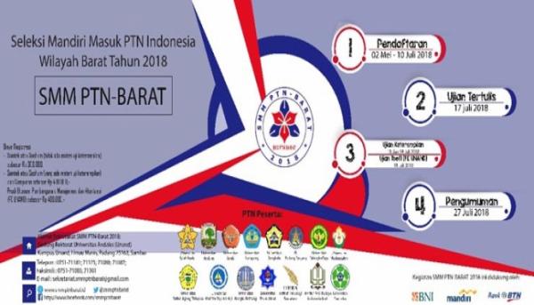 Program SMM PTN-BARAT 2018, pada dasarnya merupakan jalur seleksi mandiri oleh masing-masing perguruan tinggi yang teknis pelaksanaannya dilakukan secara bersama-sama. Seperti halnya SBMPTN, SMM PTN-BARAT adalah seleksi berdasarkan hasil ujian tulis dalam bentuk cetak (UTBC) atau kombinasi hasil ujian tulis dan ujian keterampilan calon mahasiswa yang dilakukan secara bersama dibawah koordinasi panitia SMM PTN-BARAT. Untuk Informasi klik tautan dibawah ini:
