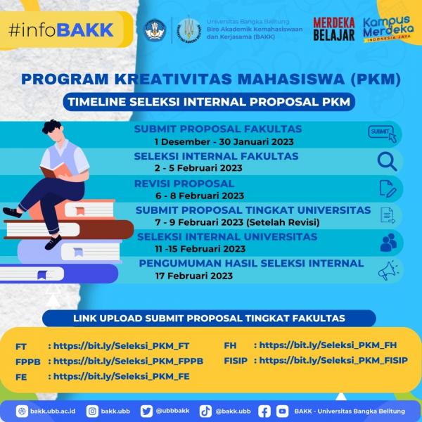 Mari ikuti Program Kreativitas Mahasiswa (PKM) Universitas Bangka Belitung. Para Sobat Mahasiswa dapat mencoba memberikan ide dan inovasi baru dalam bentuk PKM. Mari segera daftarkan diri, jangan sampe kehabisan waktu.