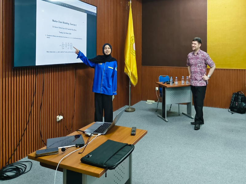 Memasuki hari kedua, Selasa 31 Maret 2026, kegiatan dilanjutkan dengan pembahasan mengenai Markov Model. Sesi pertama dimulai pukul 08.00 hingga 10.00 WIB dengan topik Markov Model Part I. Kemudian dilanjutkan dengan sesi kedua pada pukul 10.15 hingga 12.30 WIB untuk Part II. Materi ini membahas konsep model probabilistik yang digunakan dalam berbagai bidang. Peserta diperkenalkan pada penerapan Markov Model dalam ekonomi dan bisnis. Penjelasan disampaikan secara sistematis dan mudah dipahami. Hal ini membantu peserta memahami konsep yang cukup kompleks tersebut.